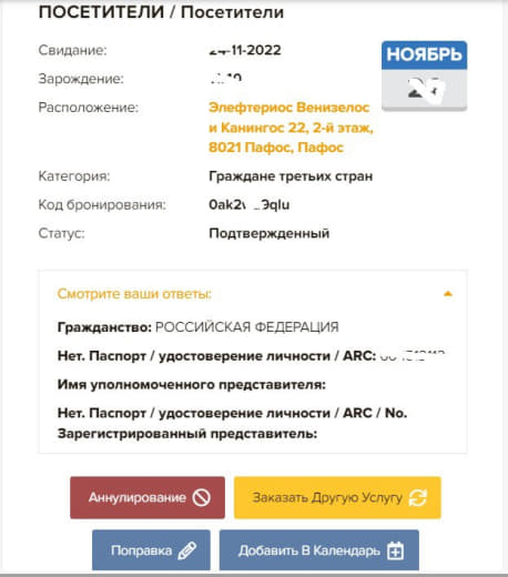 Permission in Cyprus: указан номер ARC т.к. пластика не было на тот момент